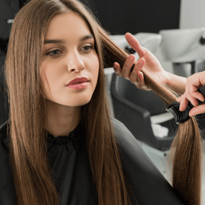 Stylist sections long straight hair in salon chair, preparing for professional hair extensions services installation
