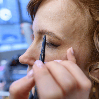 Artist shapes eyebrow with pencil and brush during lash and brow services for polished look